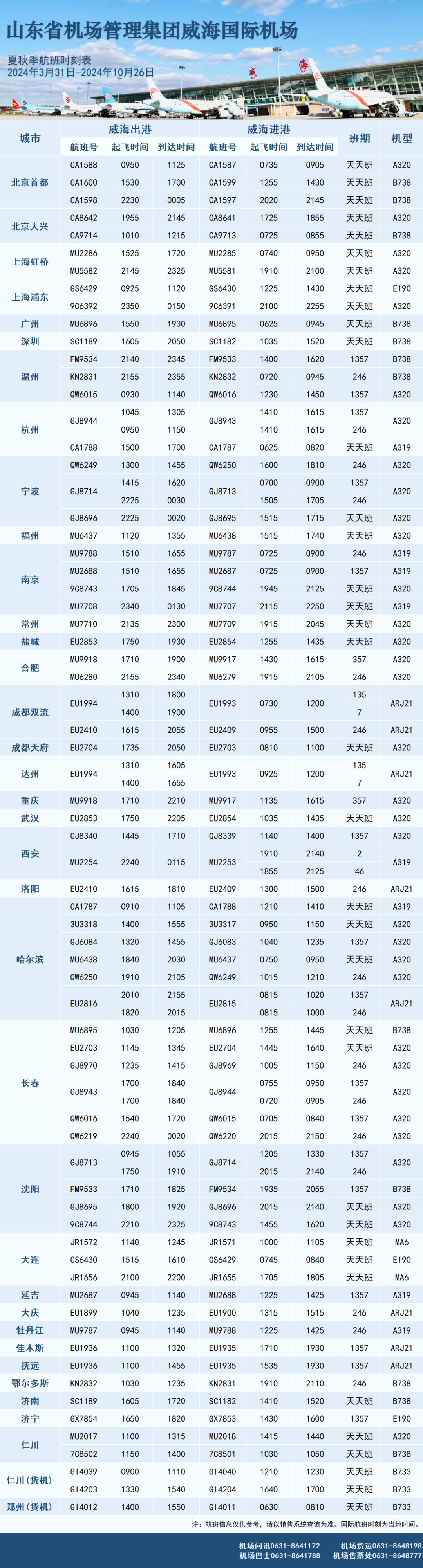 3U3317航班由四川航空?qǐng)?zhí)飛,9:50由哈爾濱起飛,11:50抵達(dá)威海,14:00由威海起飛,15:55抵達(dá)哈爾濱,每天運(yùn)營(yíng)1班,執(zhí)飛機(jī)型為A320,這是威海機(jī)場(chǎng)與四川航空合作運(yùn)營(yíng)的首條航線,至此,在威海機(jī)場(chǎng)運(yùn)營(yíng)的航空公司增至15家。常州是威海機(jī)場(chǎng)新開(kāi)航點(diǎn)。截至目前,威海機(jī)場(chǎng)通達(dá)航點(diǎn)達(dá)到35個(gè)。威?!V莺桨?9:15由常州起飛,20:45抵達(dá)威海,21:35由威海起飛,23:00抵達(dá)常州,每天運(yùn)營(yíng)1班,執(zhí)飛機(jī)型為A320。