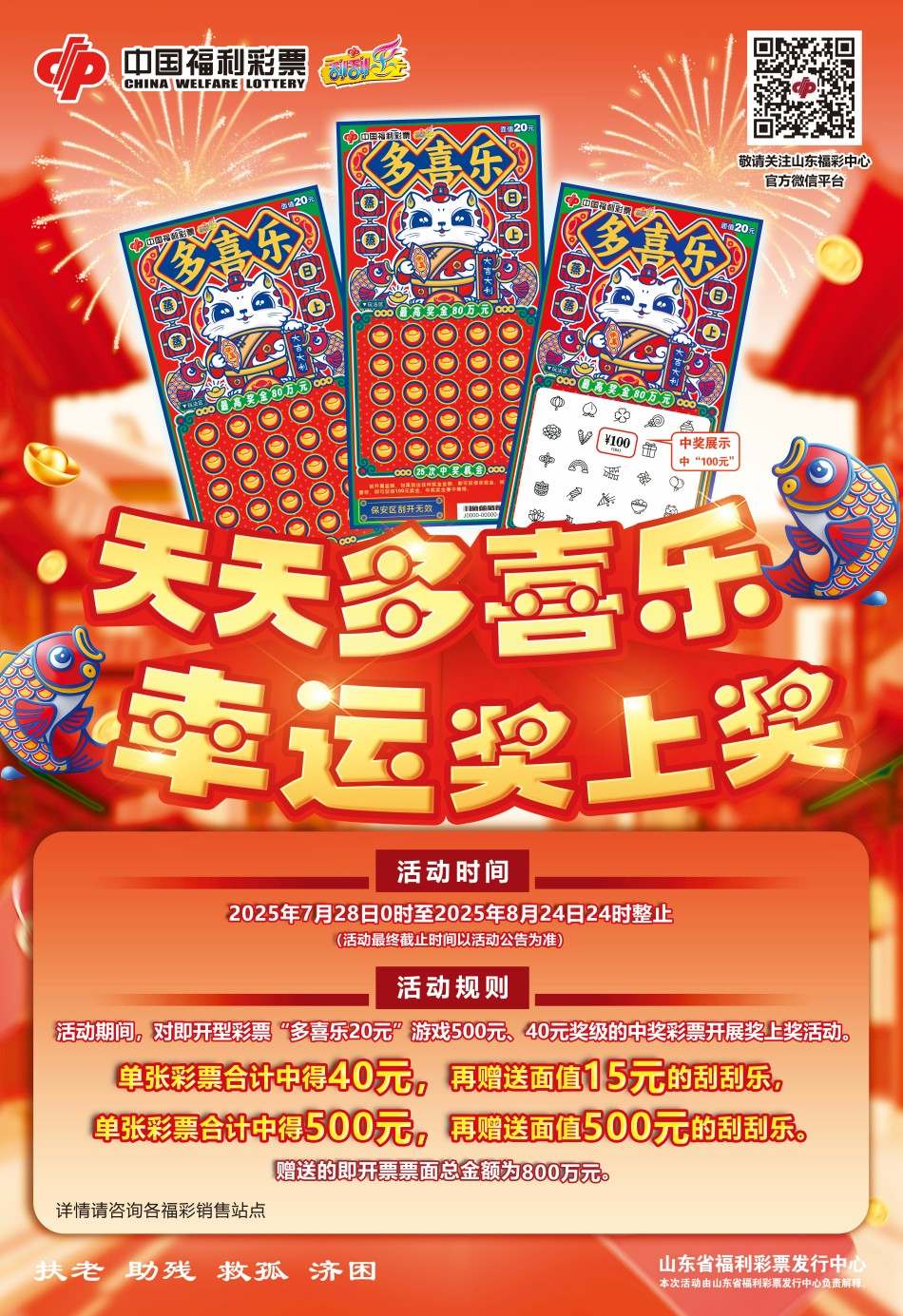 活動期間,購彩者在山東省內(nèi)福利彩票銷售場所購買即開票“多喜樂20元”游戲,單張彩票合計中得40元再獲贈面值15元的即開票,單張彩票合計中得500元再獲贈面值500元的即開票。贈送的即開票票面總金額800萬元。