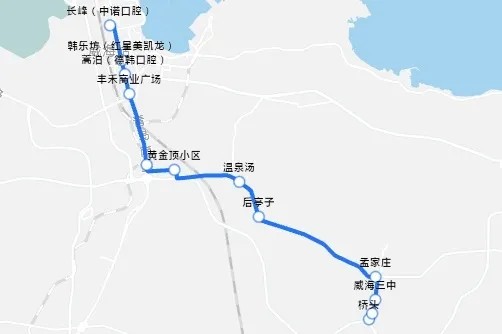 橋頭、橋頭稅務(wù)、威海三中、孟家莊、后亭子、溫泉湯、黃金頂小區(qū)、江家寨、豐禾商業(yè)廣場、蒿泊、韓樂坊、長峰,共12站。