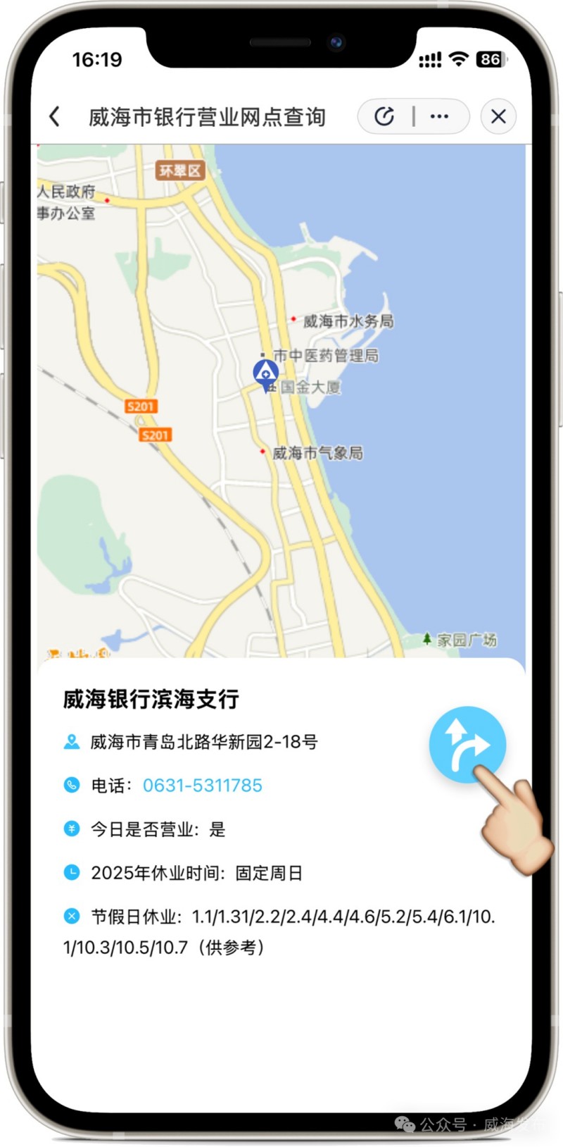 平時(shí)上班不方便,周末休假想去銀行辦理業(yè)務(wù)又不知道銀行是否休假?以后再也不用發(fā)愁了!近日,威海市大數(shù)據(jù)局聯(lián)合國家金融監(jiān)督管理總局威海監(jiān)管分局,在“愛山東”APP(威海分廳)上線了“威海市銀行營業(yè)網(wǎng)點(diǎn)查詢”應(yīng)用,基于地圖為市民直觀便捷提供全市銀行網(wǎng)點(diǎn)營業(yè)休息信息的查詢服務(wù),再也不用擔(dān)心白跑一趟了!