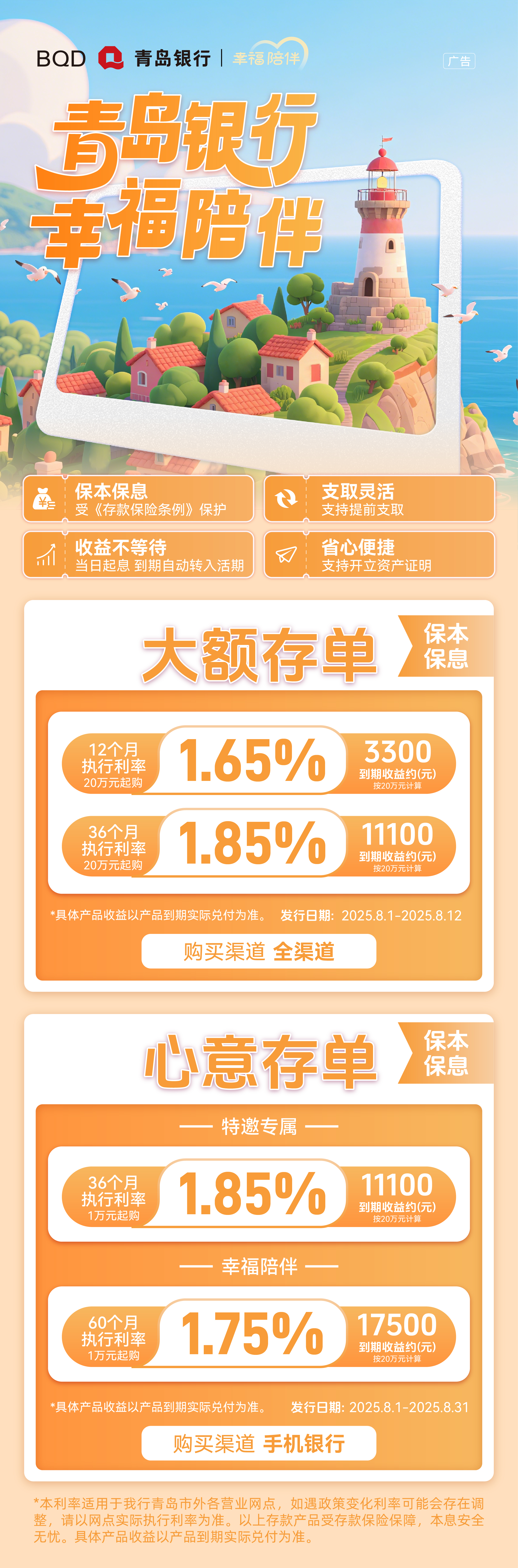 青島銀行幸福陪伴,8月份保本保息存單活動