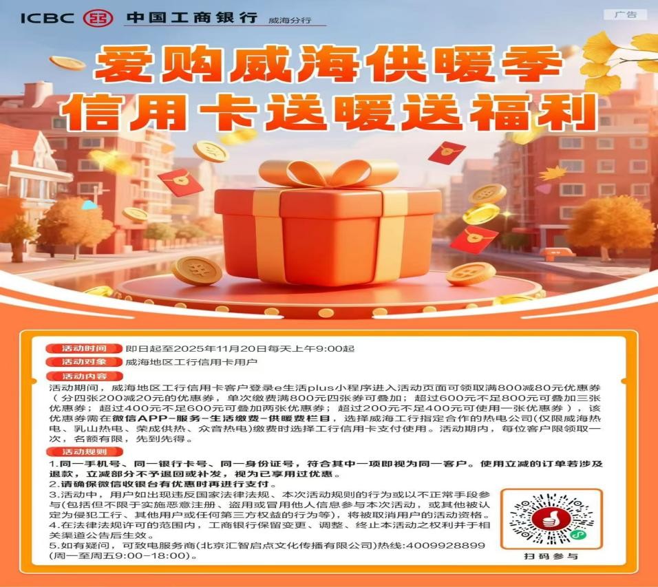 春潮涌動處,民生答卷新。近年來,站在激發(fā)消費活力賽道上,中國工商銀行威海分行始終堅守“金融為民”初心,立足威海本地民生需求,將普惠金融服務與地方經(jīng)濟發(fā)展深度融合。精準發(fā)力供暖繳費、家電更新、商超餐飲等核心消費場景,推出系列重磅優(yōu)惠活動,以“真金白銀”點燃市民消費熱情,以大行擔當書寫著服務威海高質(zhì)量發(fā)展的生動答卷。