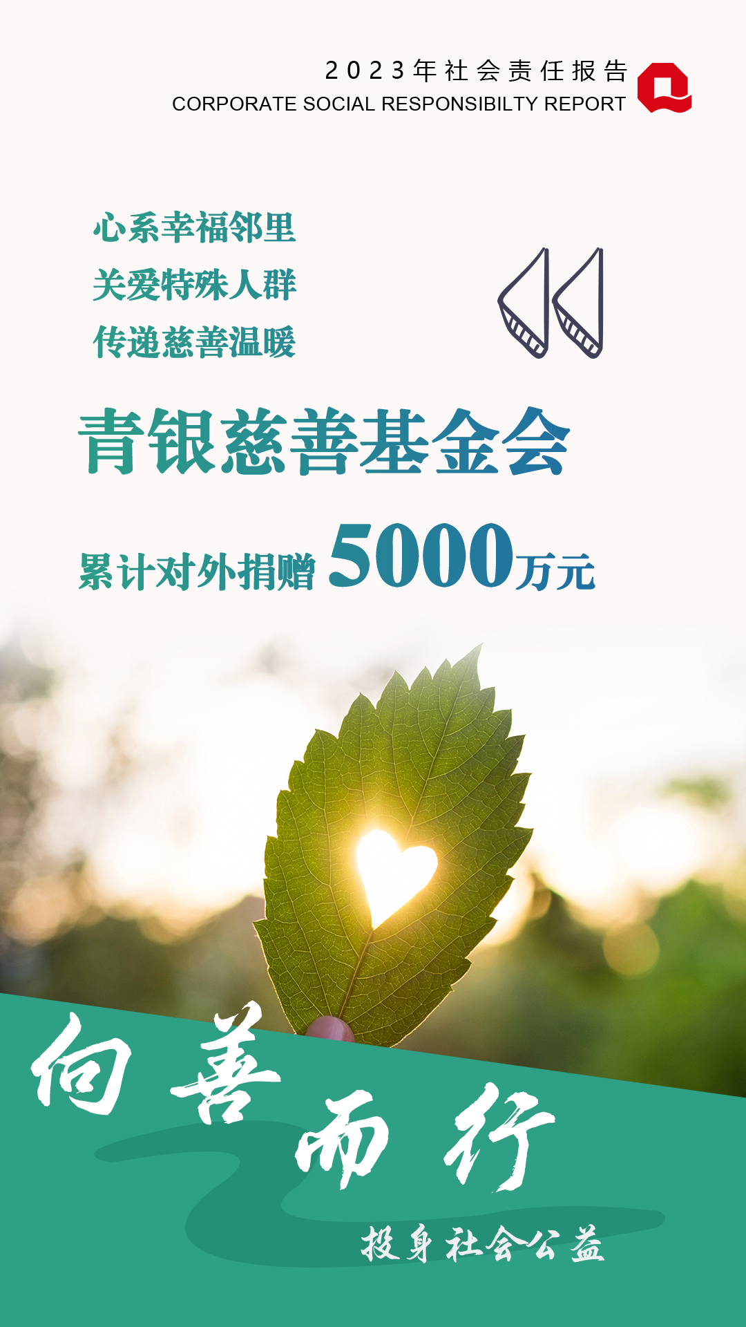 作為地方法人銀行,青島銀行始終秉持回饋社會的理念,積極投身公益事業(yè),不斷書寫“人民金融”的新篇章:“幸福鄰里”深入社區(qū),開展“黨建+志愿”活動718場,讓群眾感受“不一樣”的金融服務(wù),受眾達(dá)5.53萬人;關(guān)愛特殊人群,“青馨服務(wù)”再向前一步,銀發(fā)服務(wù)交出溫情答卷,“青馨工作室”獲中國金融工會“全國創(chuàng)新工作室”命名表彰;青銀慈善基金會傳遞慈善溫暖,積極開展捐資助學(xué)、扶弱濟(jì)貧、綠色公益、美麗鄉(xiāng)村建設(shè)等公益活動。2023年,青島銀行、青銀慈善基金會合計(jì)對外捐贈367萬元,榮獲“青島紅十字博愛金獎”、《大眾日報(bào)》“2023年社會責(zé)任企業(yè)”榮譽(yù)稱號。