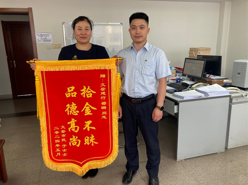5月14日下午,于女士帶著一面錦旗來到建設(shè)銀行威海文登支行,詢問邵璐是否在這里工作,要當(dāng)面感謝邵璐經(jīng)理。經(jīng)過于女士的講述,原來她的手機(jī)于上5月12日晚聚餐結(jié)束后丟失在路邊,而自己并未發(fā)覺。邵璐撿到手機(jī)后,在鎖屏照片里發(fā)現(xiàn)于女士工作的店名,繼而搜索到該店的抖音號,通過老板聯(lián)系到于女士家屬,于女士這才得知自己手機(jī)丟失。