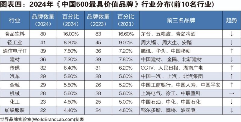 本年度《中國(guó)500最具價(jià)值品牌》排行榜中,共有來(lái)自食品飲料、輕工業(yè)、建材、傳媒、紡織服裝、醫(yī)藥、機(jī)械等在內(nèi)的24個(gè)相關(guān)行業(yè)的品牌入選。其中食品飲料業(yè)依然是入選品牌最多的行業(yè),共有80個(gè)品牌入選,占總?cè)脒x品牌數(shù)的16.00%;入選數(shù)量位居第二到第五的行業(yè)分別是輕工(41個(gè))、通信電子IT(39個(gè))、建材(36個(gè))、傳媒(32個(gè))。在衡量品牌的忠誠(chéng)度時(shí),世界品牌實(shí)驗(yàn)室參考了我信品牌(iTrust Rating)的評(píng)級(jí)數(shù)據(jù);在衡量品牌的領(lǐng)導(dǎo)力特別是ESG(環(huán)境、社會(huì)和治理)評(píng)分時(shí),參考了超級(jí)財(cái)經(jīng)(SuperFinance)的ESG數(shù)據(jù)庫(kù)。同時(shí)還借用了低碳國(guó)際(Carboncare International)對(duì)品牌企業(yè)碳排放的計(jì)量,以推動(dòng)品牌添加“碳排放評(píng)分”標(biāo)簽。