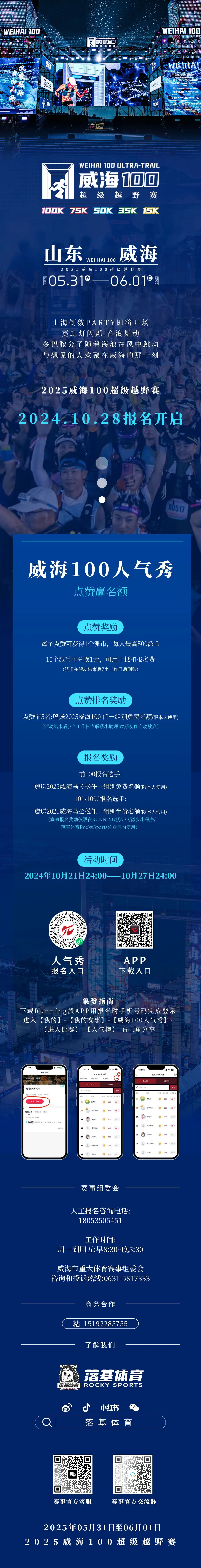 2025威海100超級(jí)越野賽由威海市重大體育賽事組委會(huì)主辦,威海市體育局、威海市體育總會(huì)承辦,煙臺(tái)落基體育有限公司具體負(fù)責(zé)賽事運(yùn)營(yíng)。賽事設(shè)100KM、75KM、50KM、30KM、15KM共5個(gè)競(jìng)賽距離,將接受不超過(guò)3000人報(bào)名參賽。